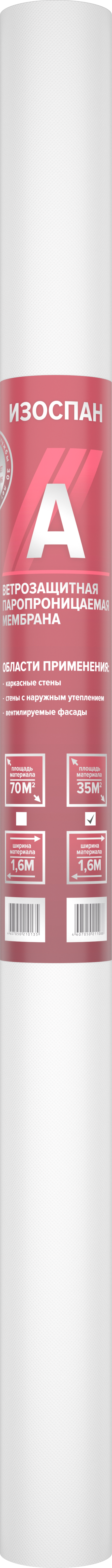 Изоспан A (35м2) — термоскрепленный полипропиленовый нетканый материал. Ветрозащитная мембрана Изоспан A препятствует конвективному движению воздуха через теплоизоляцию, снижая теплопотери. Изоспан A обладает водоупорностью, достаточной для защиты утеплителя и других внутренних элементов конструкций стен от атмосферных осадков, проникающих под наружную обшивку, при этом является паропроницаемым материалом, поэтому не препятствует выходу водяных паров из утеплителя в вентилируемый зазор. Прочность материала способствует устойчивости к механическим нагрузкам на этапе монтажа и в процессе эксплуатации.